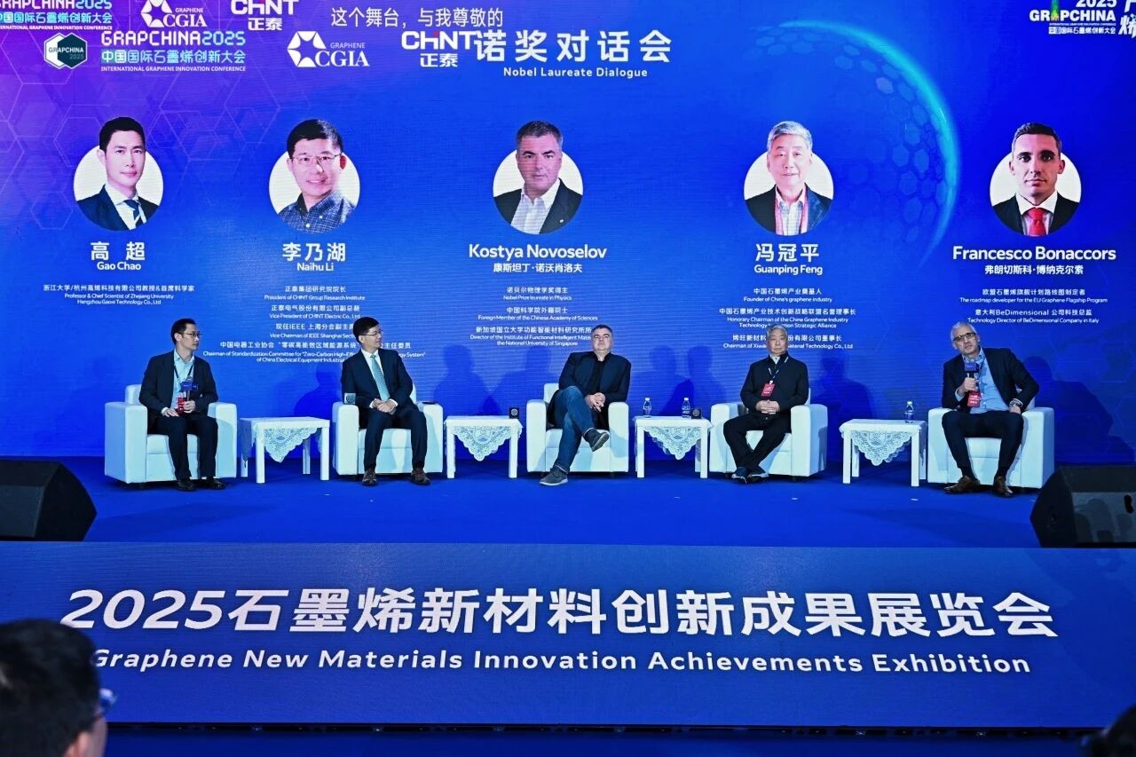11月14日,浙江大學(xué)求是特聘教授、杭州高烯科技有限公司創(chuàng)始人兼首席科學(xué)家高超與2010年諾貝爾獎(jiǎng)得主、石墨烯發(fā)現(xiàn)者之一康斯坦丁·諾沃肖洛夫,中國(guó)石墨烯產(chǎn)業(yè)奠基人、烯旺新材料科技股份有限公司董事長(zhǎng)馮冠平,歐盟石墨烯旗艦計(jì)劃路線圖制定者、意大利國(guó)家研究委員會(huì)委員、意大利BeDimensional公司科技總監(jiān)弗朗切斯科·博納克爾索,正泰集團(tuán)研究院院長(zhǎng)、正泰電氣副總裁李乃湖——五位來自全球?qū)W界與產(chǎn)業(yè)界的重量級(jí)人物首次同臺(tái),展開前沿理念與產(chǎn)業(yè)實(shí)踐的深度碰撞。